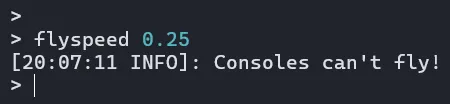 Next up, we set the player’s flight speed using the value retrieved from the player-provided float argument and send them a message to confirm the operation. It is always recommended to send a confirmation message whether the command was successful, because otherwise a player might get confused to why a command is “not working”. If the executor was not a player, we can send a form of error message. In our case, we assume the sender to be a console, as an entity usually does not try to send such a command.